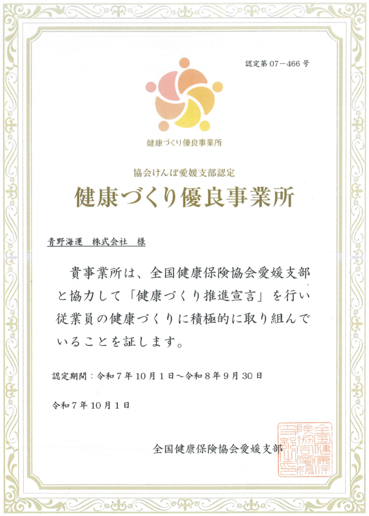 青野海運は、2025年10月1日協会けんぽ愛媛支部から「健康づくり優良事業所」として認定されました。